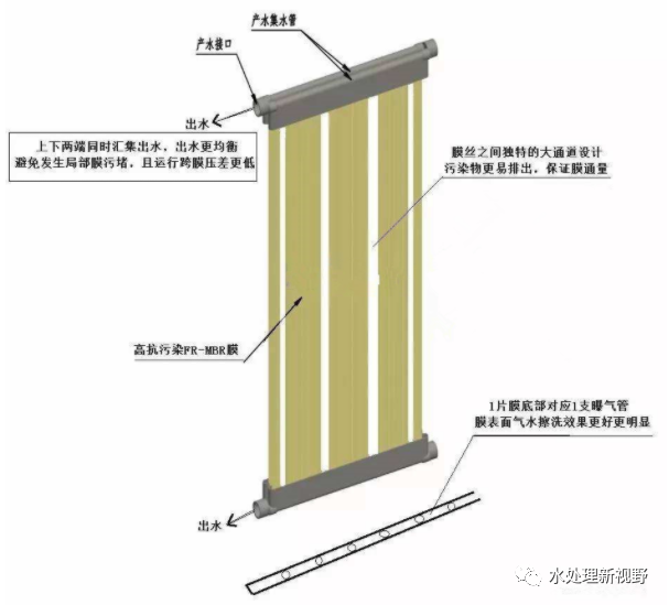 平板膜就是一片板(一般是ABS)上面有导流道,双面贴上衬布和PVDF材质的膜片,经过无缝焊接之后形成的一块膜片。还有两种膜片也称之为平板膜,一是软片膜,二是柔性膜。平板膜组件:常见的是由304不锈钢焊成的架子,将膜片一片片插入其中进行固定,装上曝气管件和集水管件等,称为膜组件。目前常见的的10-250片之间可以整数形成组件,无论单片膜的大小。从理论上讲,膜片破损,产水下降后,可以单片排查,单片更换,从而节省更换费用。